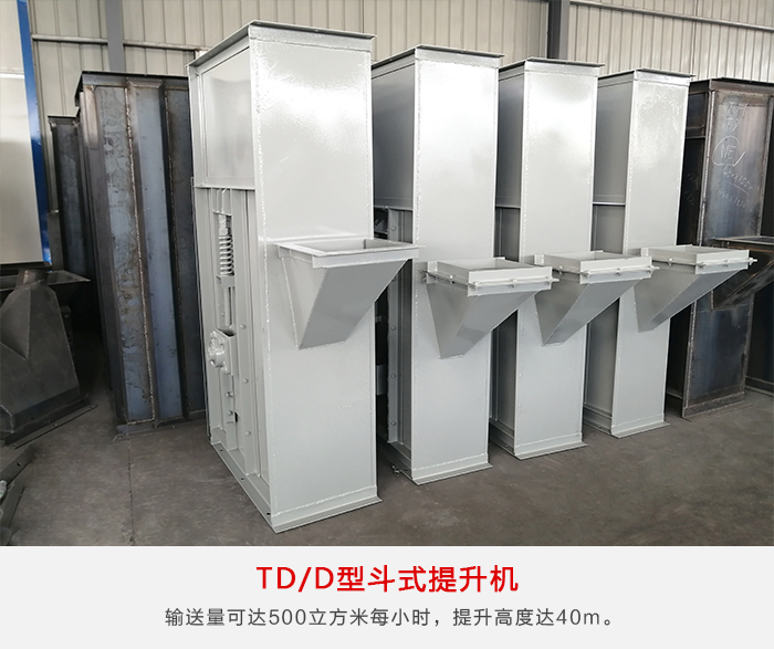 TD型斗式提升机由运行部分料斗与牵引胶带、带有传动滚筒的 上部区段,带有拉紧滚筒的下部区段,中间机壳,驱动装置,逆止制动装置等组成。无故障时间超过2万小时,输送量可达500m³/h,提升高度达40m。