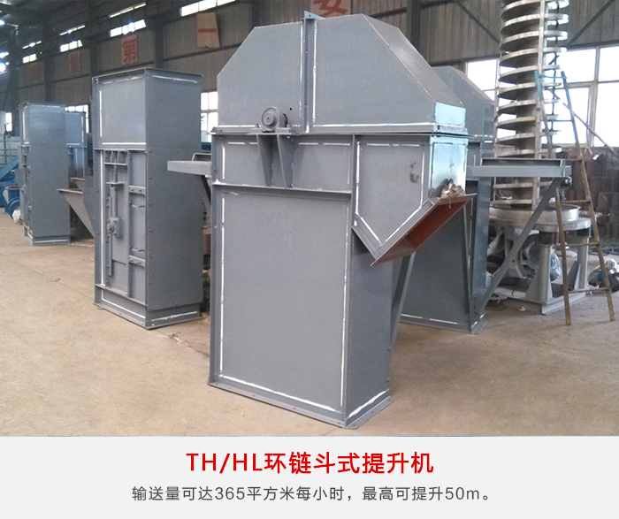 TH/HL环链斗式提升机牵引机构是两根环形链条,为混合或重力方式卸料,掏取式装料,输送量可达365m³/h,最高可提升50m。