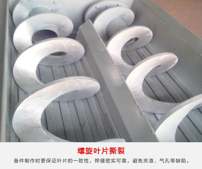 1、由于原料中异物等可造成螺旋叶片损坏,严重时螺旋叶片与螺旋轴焊接处脱焊,形成螺旋叶片撕裂,螺旋叶片损坏需提高备件质量和强度,在备件制作时要保证叶片的一致性,焊缝密实可靠,避免夹渣、气孔等缺陷,保证焊接质量,同时提高螺旋轴及传动轴的强度。