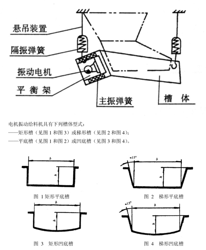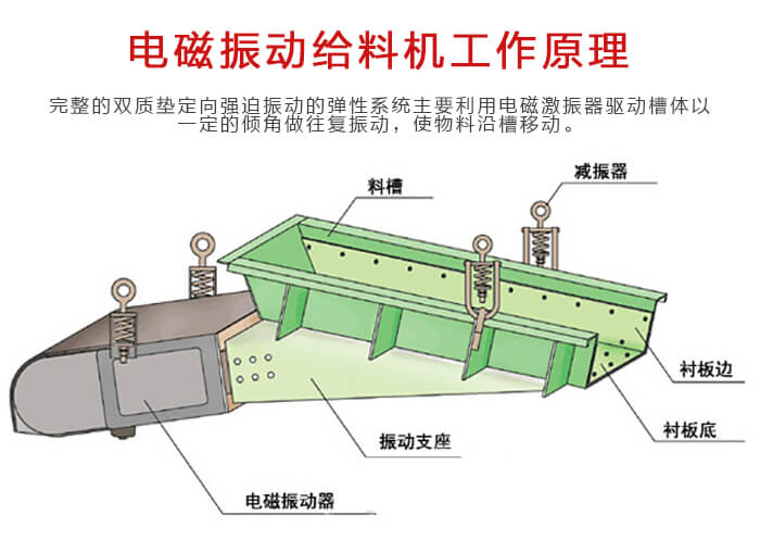 电磁振动给料机是一个较为完整的双质垫定向强迫振动的弹性系统, 整个系统工作在低临界共振状态,主要利用电磁激振器驱动槽体以一定的倾角做往复振动,使物料沿槽移动。