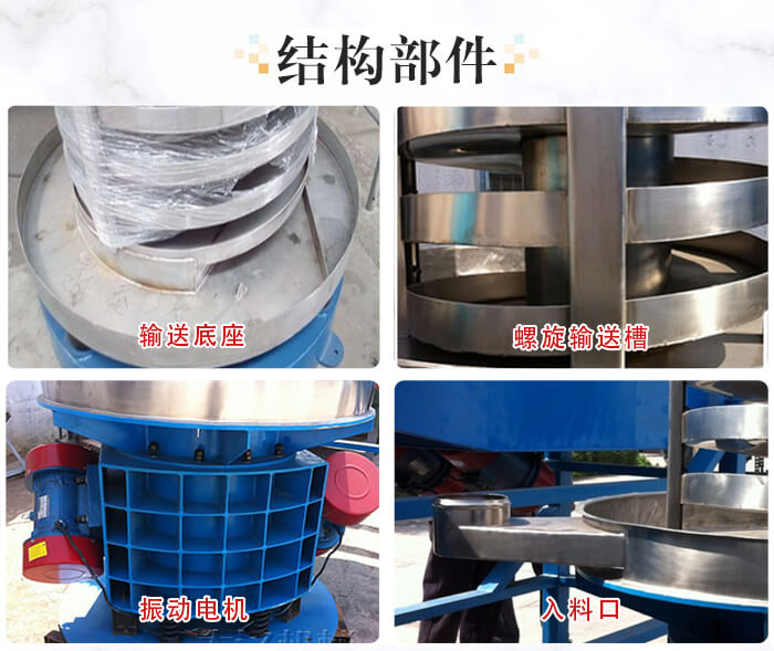 垂直螺旋提升机的主要结构由:进出料口、法兰、减振系统、振动电机和底座这几部分组成。
