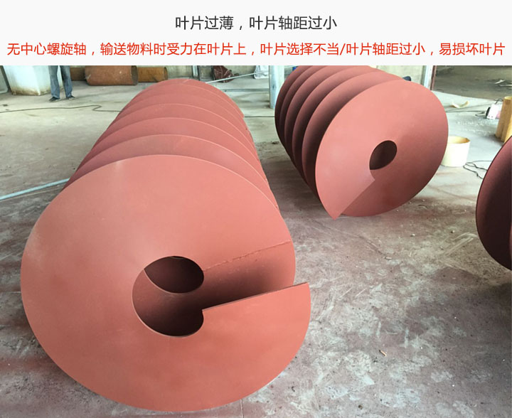 叶片轴距过小:螺旋槽体选择不当,输送物料的时叶片轴距过小,会造成挤压力过大,损伤叶片;若槽体较小,同样也会造成压力过大,导致叶片损害。
